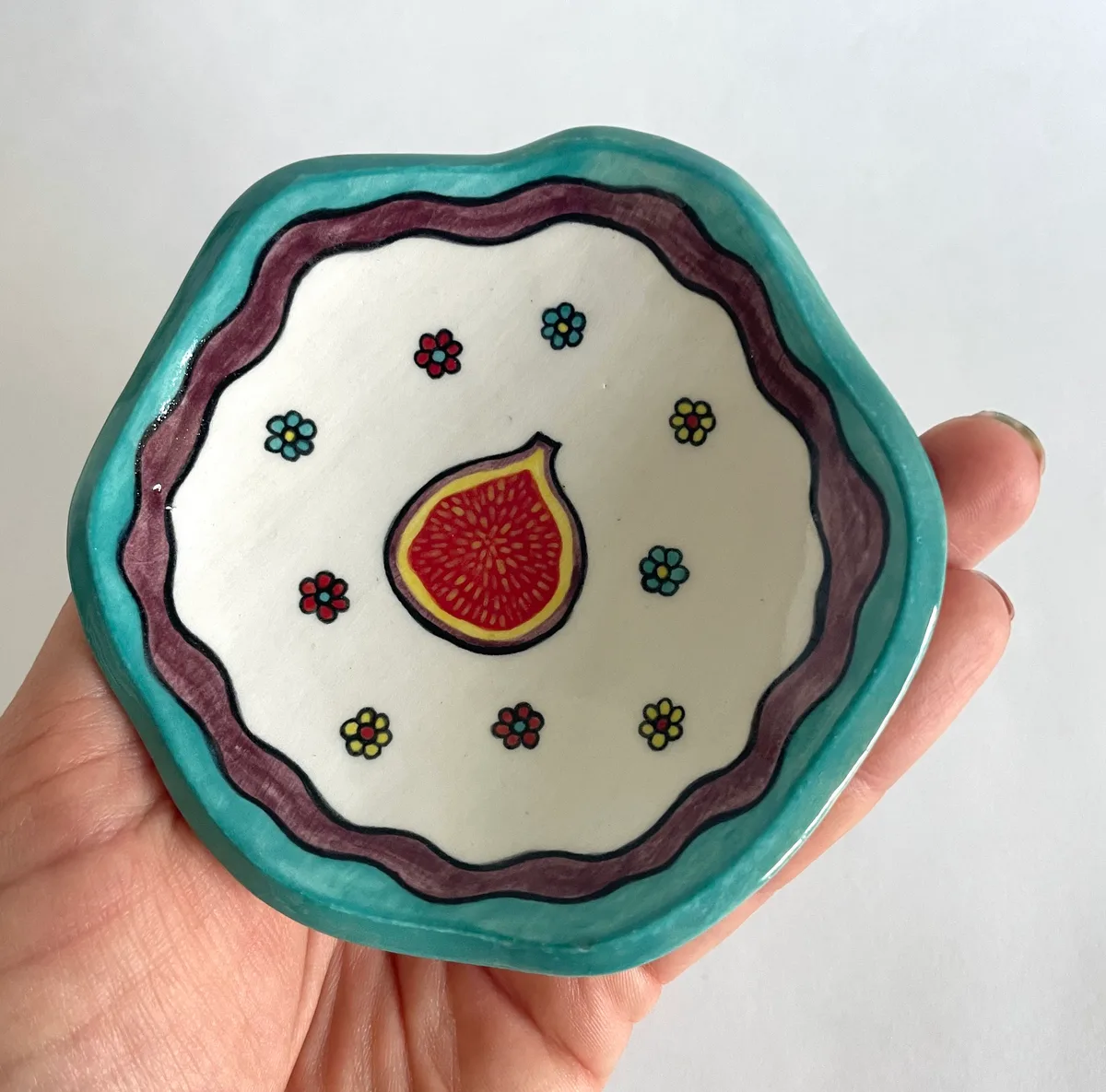 Handmade olive oil bowl with tatreez-inspired surface pattern in blue.