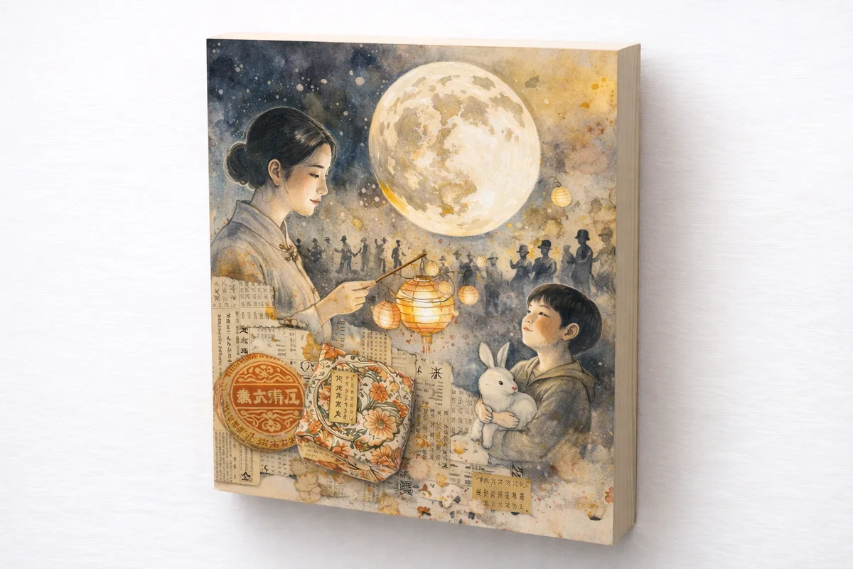 Mixed media collage combining ink illustration with vintage Chinese newspaper clippings and hand-painted mooncake wrappers. The layers create a palimpsest of cultural memory and seasonal celebration. Mounted on cradled panel.