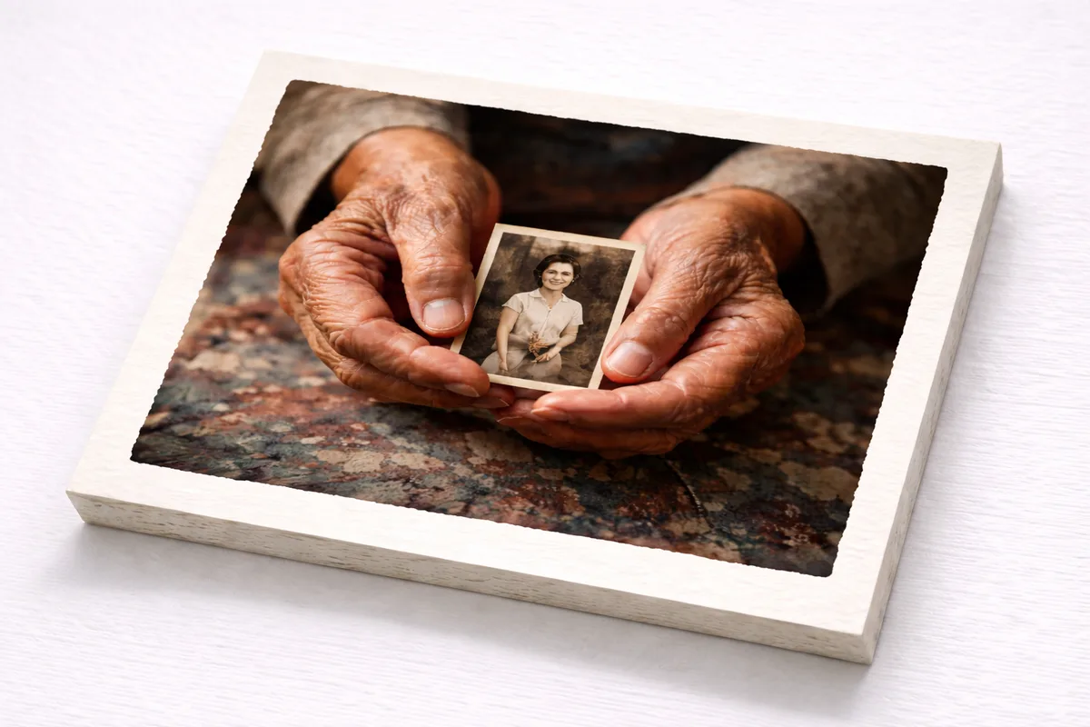 Intimate portrait of the artist's grandmother's hands holding a photograph of herself as a young woman. Shot on 4x5 large-format film. The shallow depth of field draws attention to the textured skin and the small faded photograph.