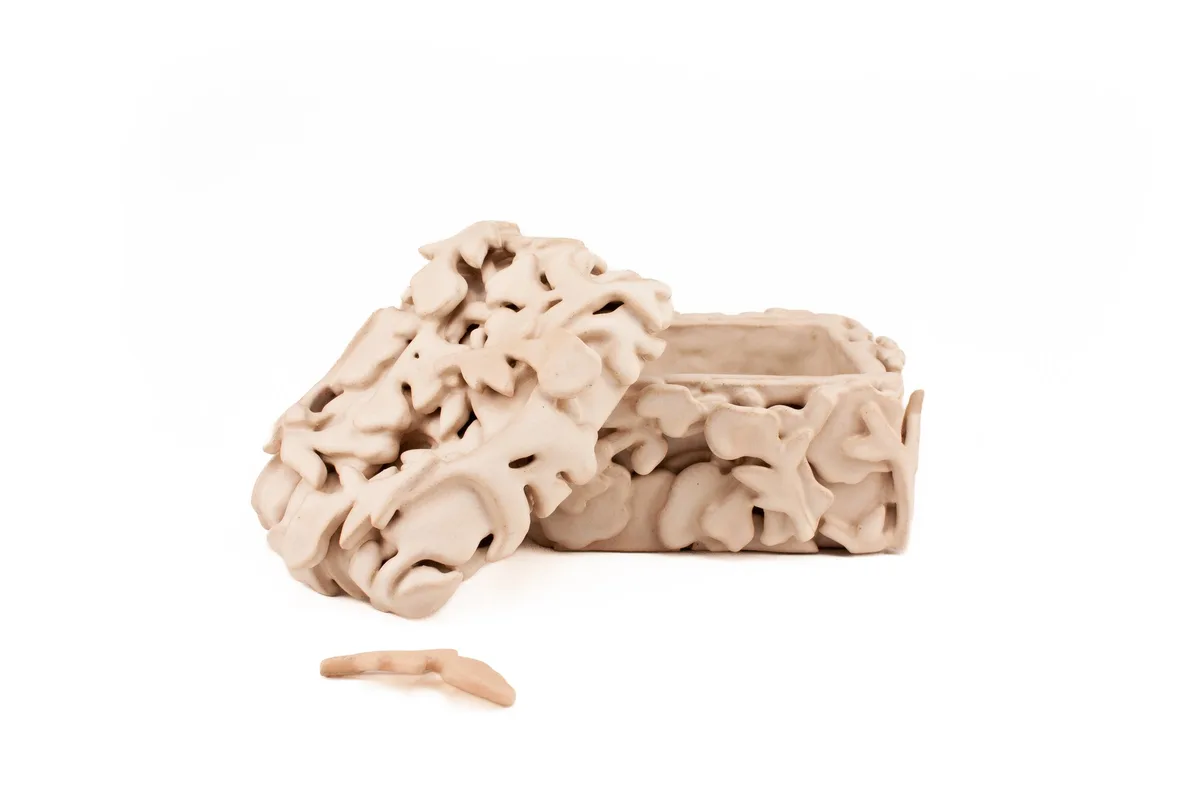 Functional lidded box with embedded key detail, made with stoneware and glaze.