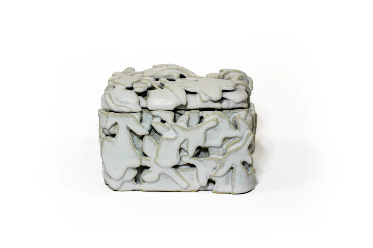 Functional lidded box with embedded tea bag detail, made with stoneware and glaze.